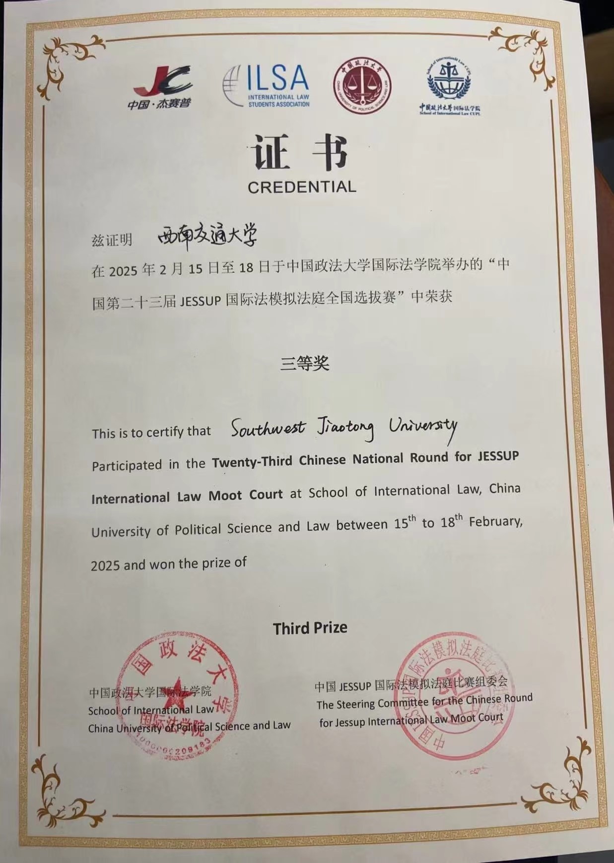 2025年2月15日至18日,第二十三届“杰塞普”国际模拟法庭(Phillip C. Jessup International Law Moot Court Competition)中国赛区选拔赛在中国政法大学圆满举办。这场全英文模拟法庭赛事云集北京大学、中国人民大学、中国政法大学、北京师范大学等66所顶尖法学院校的优秀学子。西南交通大学公共管理学院法学系代表队在这场高水平全英文模拟法庭竞赛中脱颖而出,首次参赛即荣获全国三等奖,书状全国第六名。