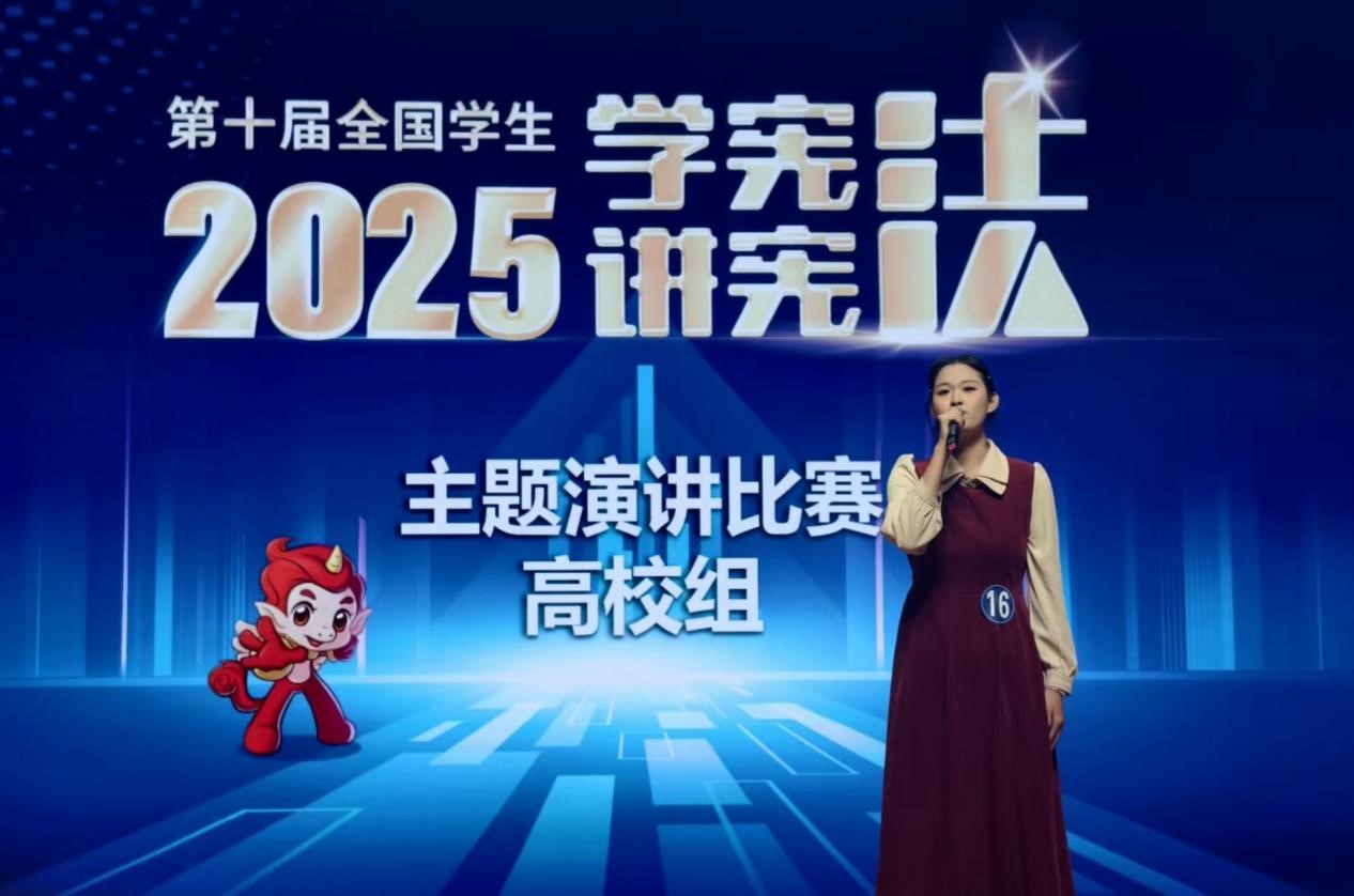 在主题演讲中,崔喆同学表现出色。她的演讲《一个少年的四天,一个国家的四十年》构思精巧,以翟婉明院士的故事为脉络,将个人命运、国家发展与宪法精神紧密相连,叙事宏大而情感真挚。从绿皮火车的艰难岁月到高铁飞驰的强国风采,她娓娓道来,极具画面感与感染力,并精准引用宪法第二十条,深刻阐释了宪法作为国家发展根本保障的磅礴力量,展现了她对宪法精神的深刻理解与卓越的舞台感染力。在紧随其后的即兴演讲环节,崔喆同学同样发挥稳定,她沉着冷静、思维敏捷,在短时间内迅速组织语言,呈现了一场逻辑清晰、论述流畅的精彩演讲。成绩取得的背后,是数月以来她反复打磨讲稿、刻苦练习的身影,勤奋与专注最终在赛场上绽放出最耀眼的光彩。