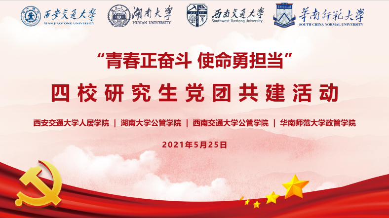 述往思来,向史而新。党的历史是最生动、最有说服力的教科书。我们党已经发展成为一个走过百年光辉历程、在最大的社会主义国家执政70多年、拥有9100多万党员的世界上最大的马克思主义执政党。重温党领导人民革命、改革、建设社会主义的历史进程,不难发现,百年历程离不开一代又一代心怀国运的中国青年,他们为国家富强、民族振兴、人民幸福不懈拼搏奋斗。为深化学生党员党史学习教育,用党的奋斗历程和伟大成就鼓舞青年党员斗志、明确方向,用党的光荣传统和优良作风坚定信念、凝聚力量,用党的实践创造和历史经验启迪智慧、砥砺品格。2021年5月25日,西南交通大学公共管理学院硕士2020级公共管理第一党支部联合西安交大人居学院2020级专硕党支部、湖南大学公共管理学院2020级研究生党支部、华南师范大学政治与公共管理学院2020级研究生职教党支部共同组织开展“青春正奋斗 使命勇担当”四校研究生党团共建活动。